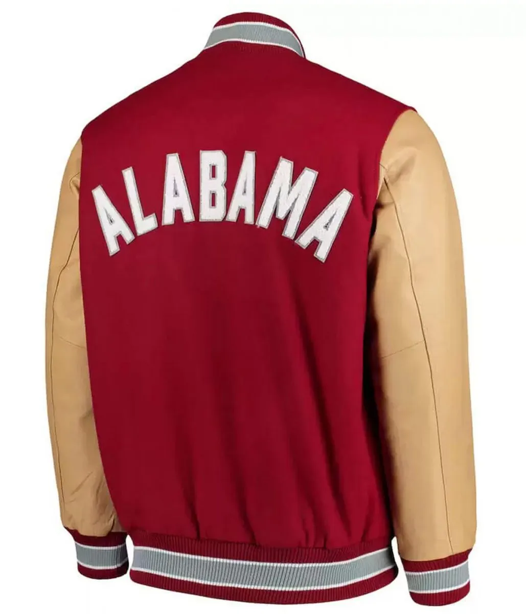 The red and Brown alabama crimson tide varsity jacket features leather sleeves with a crimson tide logo embossed on the right chest and Alabama logo on the back. In addition, this versatile jacket is made of wool and leather material whereas the body made from wool and the sleeves made from genuine leather. Inside viscose lining, front buttoned closure, rib knitted collar, rib knitted cuffs and two front flap pockets give this alabama crimson tide red varsity jacket a distinctive look while compare with other varsity outfits.